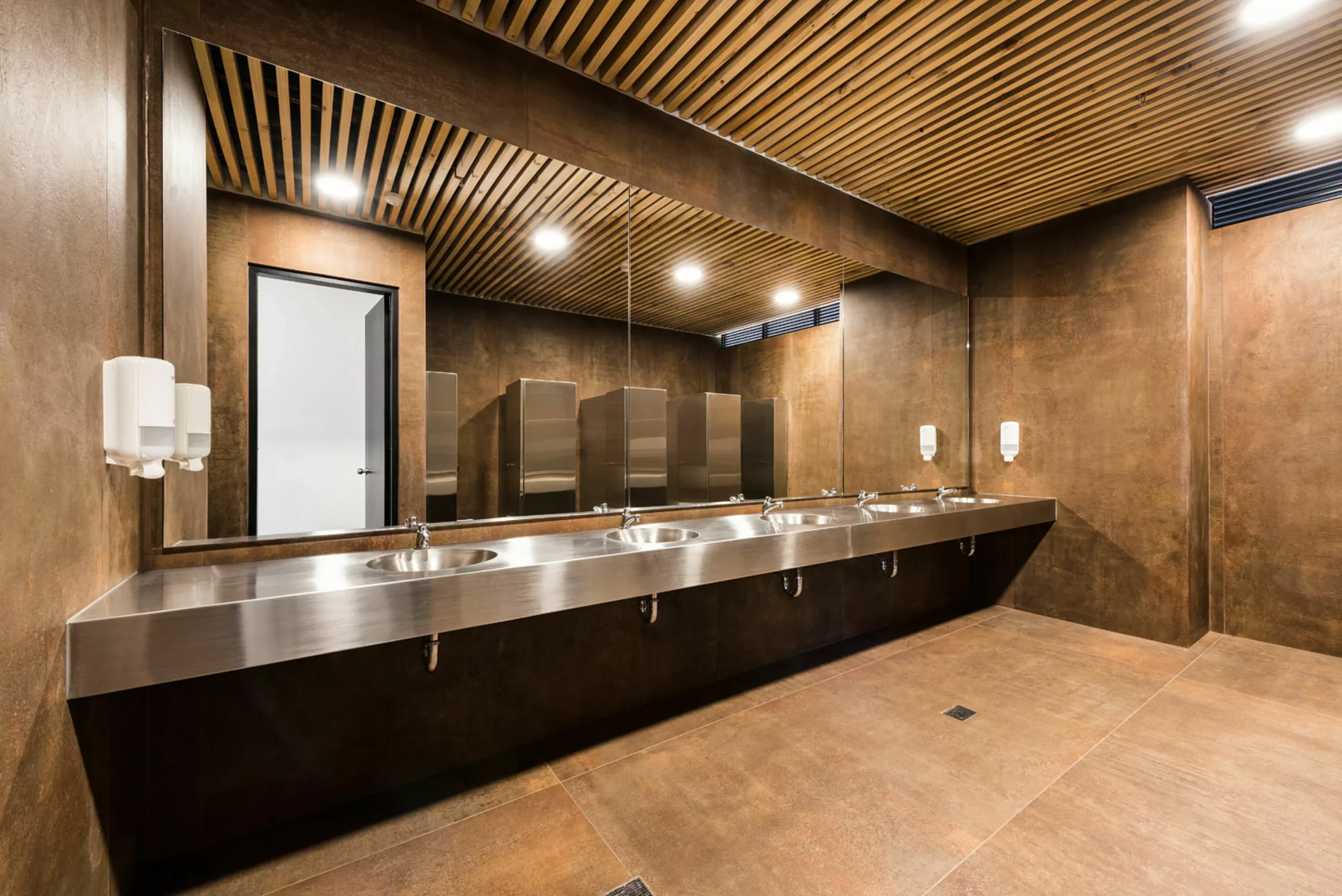 Coverlam sa využil aj vo vnútri objektu. Podlahy a steny hygienických priestorov sú riešené vo veľkých formátoch, ktoré minimalizujú škáry a uľahčujú údržbu. Priestor pôsobí kompaktne a čisto, čo je dôležité pri verejných budovách s vysokou návštevnosťou.